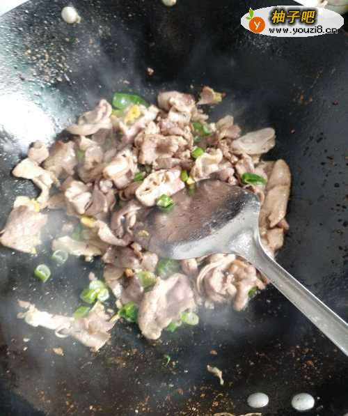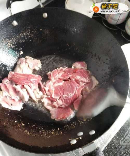 5第五步,向铁锅中倒入切好的羊肉和廋肉,在锅中翻炒至变色。