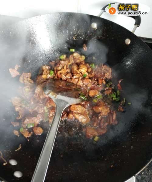 6第六步,在已经炒至变色的肉中倒入葱和姜,再倒入适量的生抽和老抽,翻炒一会。