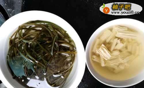 第一步,先把需要一起烹饪的食材准备好,把海带丝、木耳、腐竹和黄花菜等需要提前泡一泡的食材切好泡入水中。