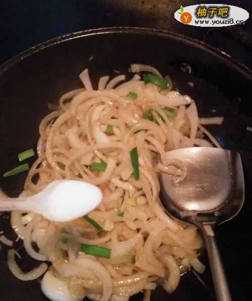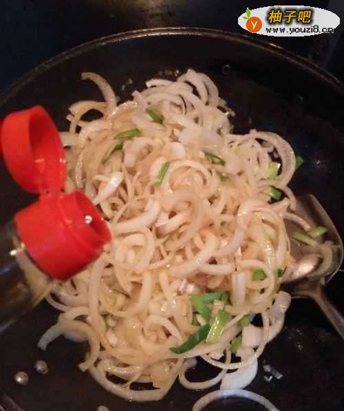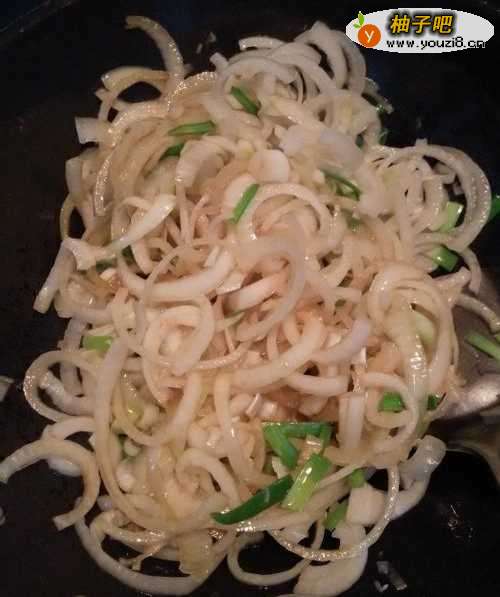 3因为洋葱的葱味非常浓,所以不用葱炝锅,直接放洋葱丝。