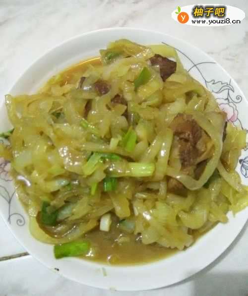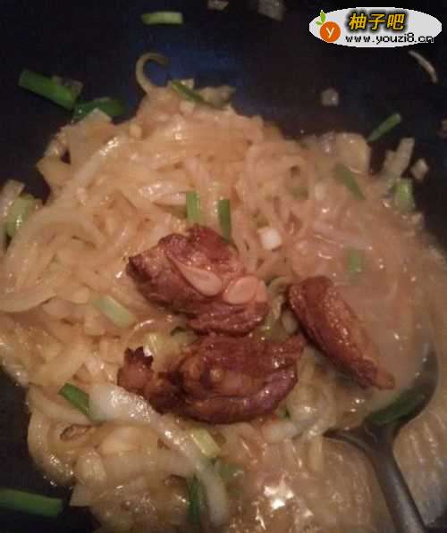 7等洋葱炒熟,呈半透明状,没有了辣味之后,就可以装盘了。洋葱熟后,稍微有一点甜味,再加上浓浓的肉香,特别好吃。