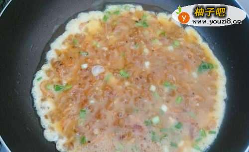 9平底锅烧热倒油,把蛋液倒进去摊平。