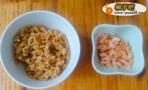 菜脯在清水里浸泡半个小时,然后切成小丁,磷虾干冲洗掉杂质,沥干水份备用。
