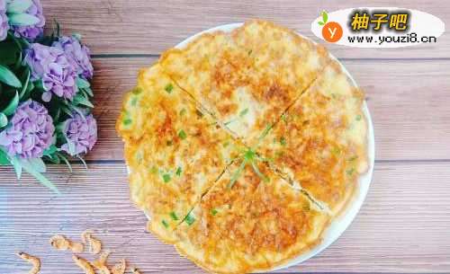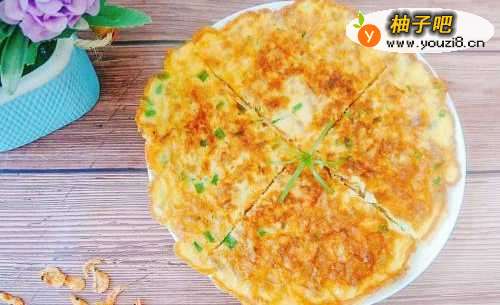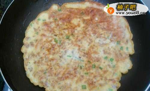 7:平底锅烧热倒油,把蛋液倒进去摊平,煎至两面熟透即可。