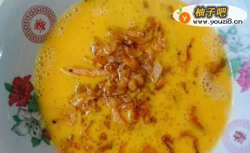 7将炒好的菜脯磷虾晾一晾,然后倒在蛋液里。