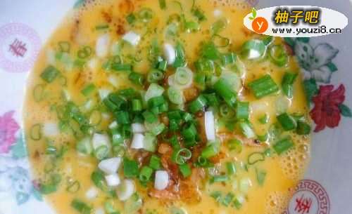 6:将炒好的菜脯磷虾晾一晾,然后倒在蛋液里,撒入葱花。