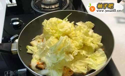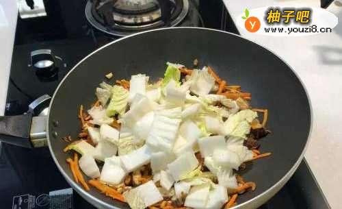 4再加入大白菜梗炒软炒出水,时间约1分钟