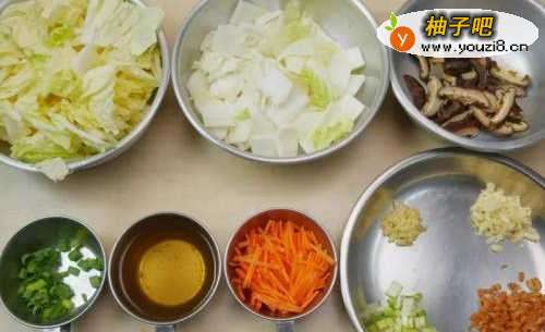 准备食材,大白菜切小片,菜梗分开;干香菇泡软后去蒂头切厚片;蒜头、姜切末;葱切葱花
