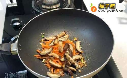 3再加入红萝卜丝、香菇片炒香,时间约1分钟
