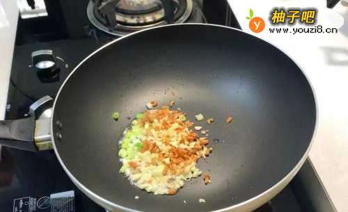 2中小火热油,加入虾米、蒜末、姜末、葱白后炒香
