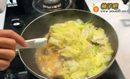 5最后加入大白菜叶、香菇水后上锅盖焖煮约2分钟