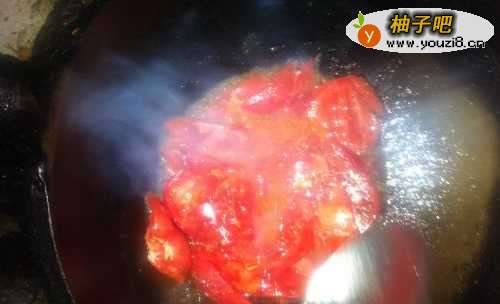 5锅放油,加鸡蛋,西红柿翻炒,将西红柿炒软。