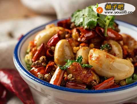 2爆浆鸡肾。精选大块优质鸡肾,秘制调料码料配制后早已没有腥味,小碗内鸡肾爆浆嫩滑,红油淋面搭配老成都麻椒、干辣椒、香菜、葱花及花生碎入味,集麻辣鲜香于碗内,入口Q滑爽弹口感纯粹,细细品味都是难忘的味道。