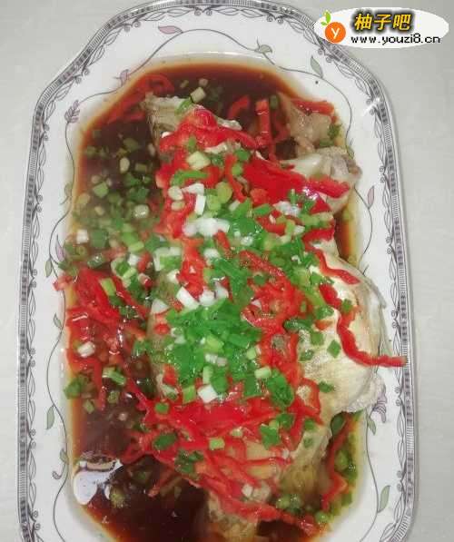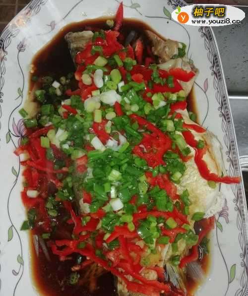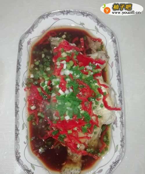 9将红椒丝、葱沫均匀撒在鱼身败夏痕上,倒入适量的鲜酱油。