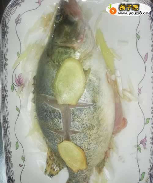 5将葱丝垫在盘底,放上鳜鱼,用料酒、少量的盐、醋,均匀涂抹鱼身,肚中和鱼身贴上姜片。