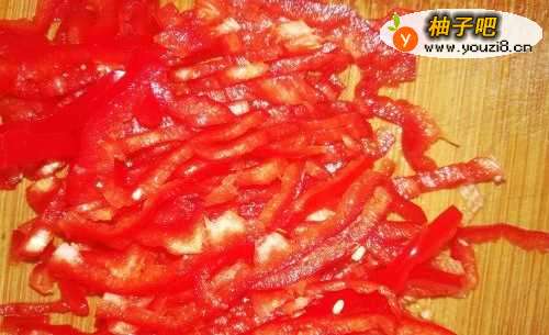 7在蒸鱼的同时,红椒切丝、香葱切碎,备用。
