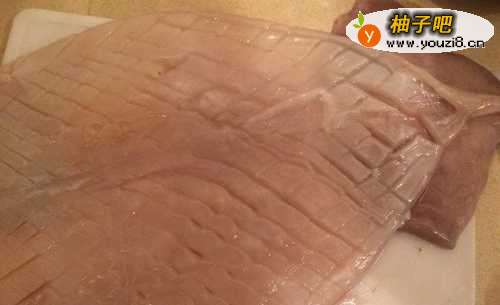 3将鱿鱼洗干净,把鱿鱼放到砧板上,各自在两边轻轻的划上一刀。(这样做呢,待会炒鱿鱼的时候就能使鱿鱼卷起来,看起来很有卖相)划好后,将鱿鱼分成两半,再按自己喜欢的大小来切成一块一块的。