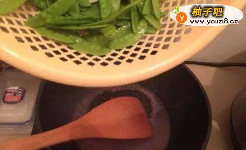 6接着,在往锅里倒少许油。同样是等待油热起来后,将荷兰豆放到锅里爆炒,然后再往锅里下一点盐,翻炒几次后,往锅里加入少许的水。等待水煮开。