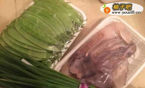 2接着,就来处理鱿鱼。(有些菜市场会帮你处理干净并切好,但我这是在超市买的,所以并没有处理好,也可以学一下怎么处理鱿鱼哦)