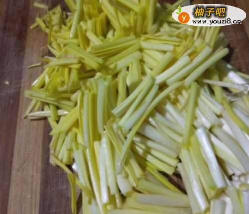 2如图,把洗净的蒜黄切成短短的条状。