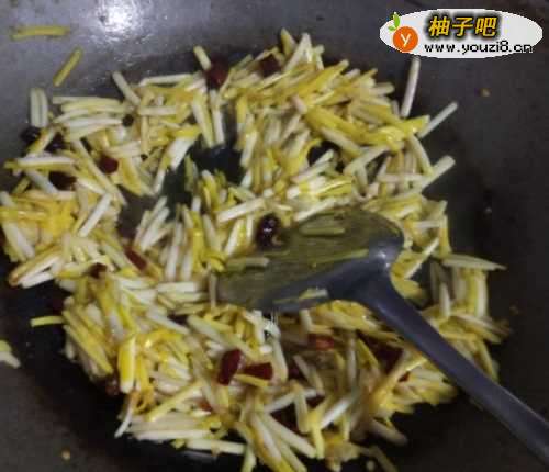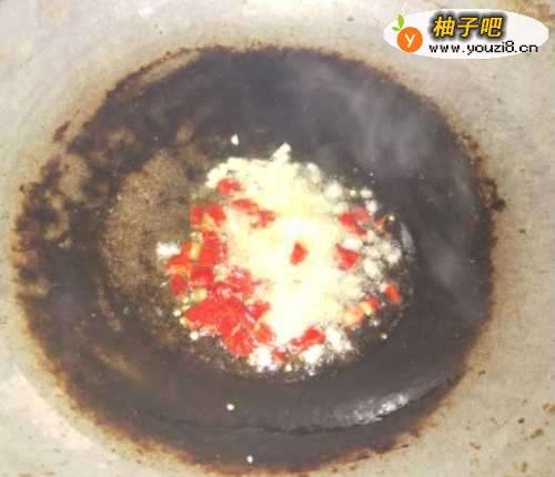 5如图,放入切好的蒜黄,放入香醋、食盐、五香粉,不断地翻炒,火候要大,这样才能爆出香味来哦。