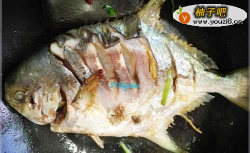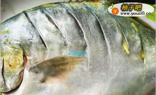 挑选一只新鲜的金鲳鱼,看鱼眼睛,清澈有神不发白的为佳,同时最好活蹦乱跳有活力的。让卖鱼师傅帮忙处理一下鱼,带回来自己清洗几遍,鱼肚内也要用水冲一冲,然后用刀将鱼两侧划开一些口子。