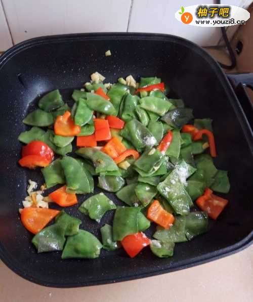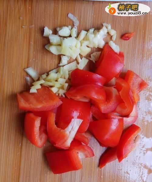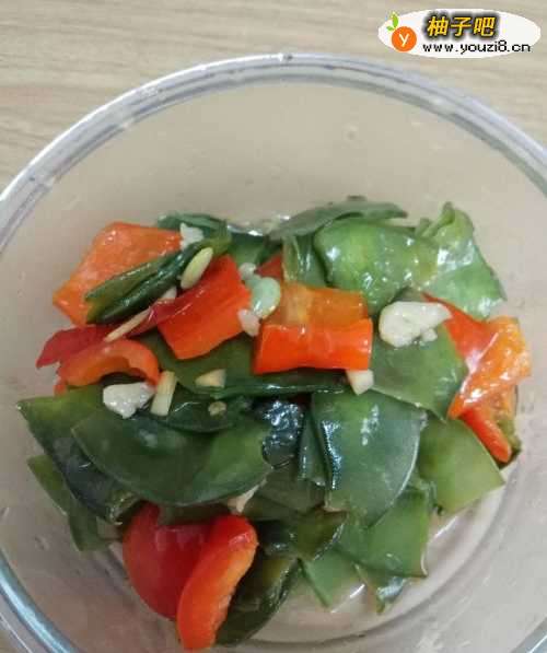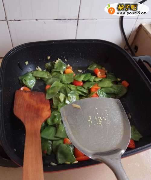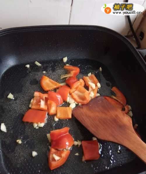 3锅里放入适量的色拉油,待油烧热后,把蒜末和青红菜椒放入油锅里爆香