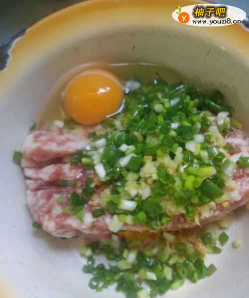 3把姜、葱、虾皮切好后放入肉里,再打个鸡蛋,加入盐、鸡精搅拌均匀