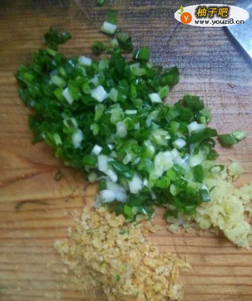 2姜、葱、虾皮切好剁碎(虾皮可以提鲜)。