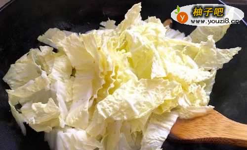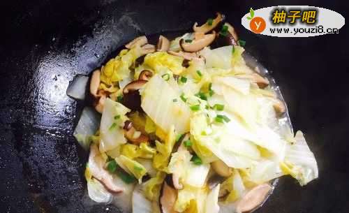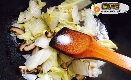 3香菇变软之后倒入大白菜继续翻炒,翻炒至大白菜稍微出水即可,如果大白菜没有出水,稍微加一点水也行。