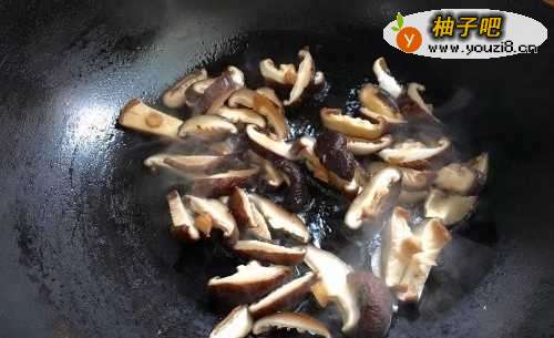 2接着开火,锅烧热之后倒入少许油,油温至8成热的时候先把香菇片倒进去翻炒,炒至香菇变软即可!