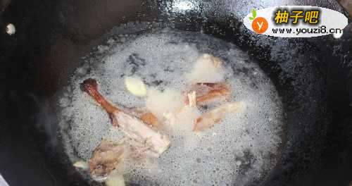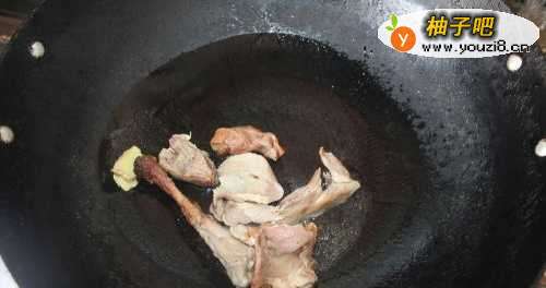 3锅中放油烧热,放入姜和鸭骨炒香。