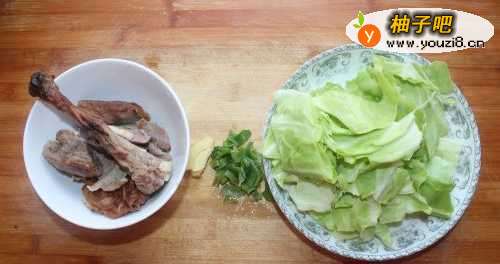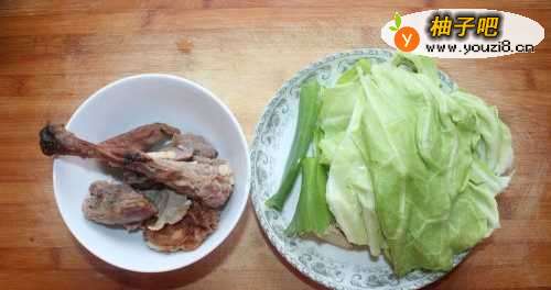 准备好鸭骨、圆白菜、葱、姜,还要准备面条。