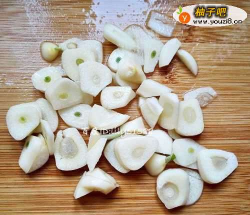2大蒜洗净,切片备用。