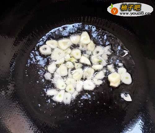 3热锅先放油,再放入大蒜片爆香。