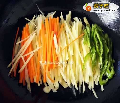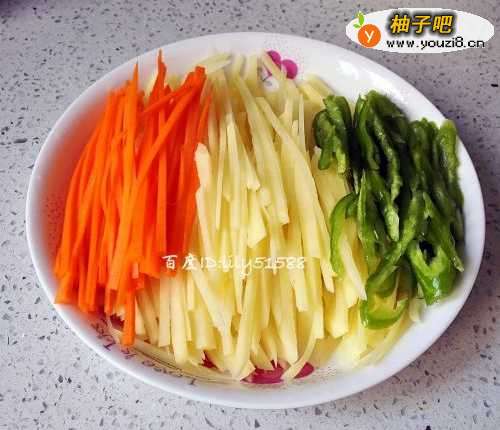首先将土豆、胡萝卜削皮洗干净,分别切丝。青椒洗干净,切丝备用。
