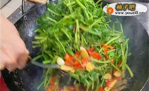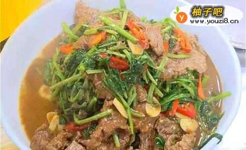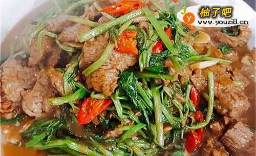 用啤酒泡20分钟,倒掉啤酒再腌制过油可使牛肉软嫩好吃,加上空心菜拌炒,沙茶酱的调味,让这道菜更加美味可口。