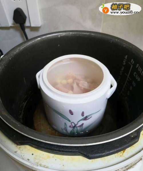 55.电饭煲里加水,把炖罐放入锅中。