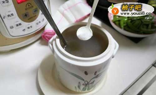 77.好了之后,加入一勺盐,搅拌均匀,清淡好喝的猪肚莲子汤就好。
