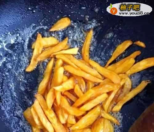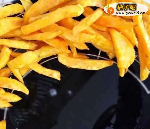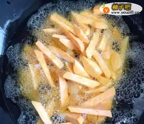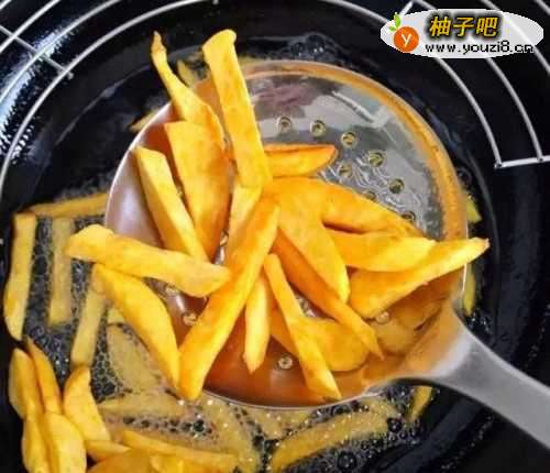 3将切好的红薯倒入油锅中,炸成金黄色。