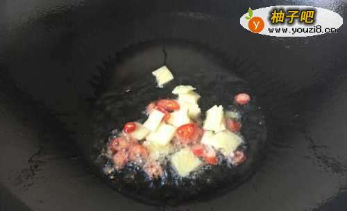 5锅内留底油,爆香姜片和小米椒圈。