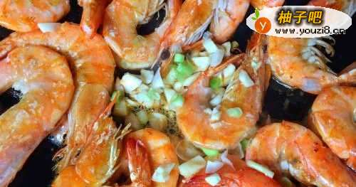6转中火倒入大虾双面煸至微焦黄,再倒入蒜碎及葱碎一起爆香