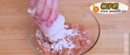 2鸡肉腌好后,再加入60g淀粉搅拌均匀。