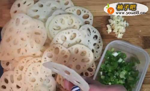 莲藕洗净去皮,切薄片,蒜头2颗拍碎切末,葱段洗净切末备用