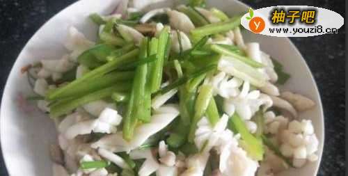 鱿鱼焯过水,稍微翻炒片刻就好了,不要炒太久,最后放盐味精。
