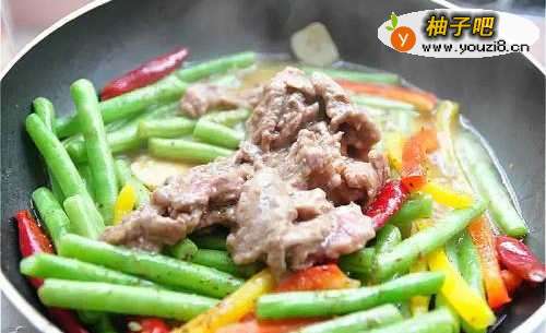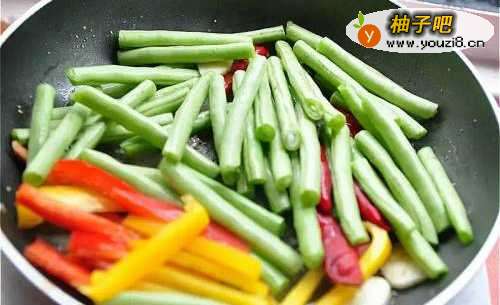 3再加1大匙油,将四季豆、彩椒下锅拌炒,然后加入少许的水,盖上锅盖让其约闷煮熟。