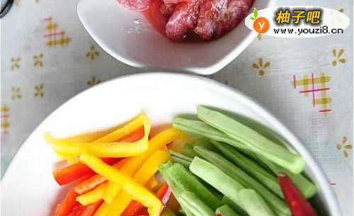 将牛肉片以少许玉米粉、香油和酱油抓捏腌制一下,四季豆切段、彩椒切细条、蒜头切片、干辣椒备用。