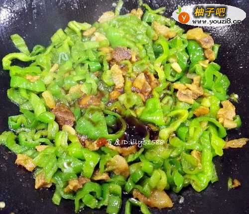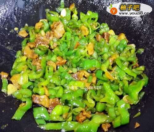 8放入调料之后,将青椒和油渣翻炒均匀入味,关火装盘。
