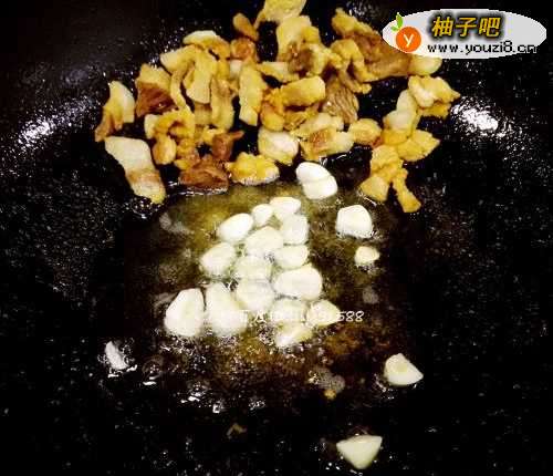 5炸好的油渣不需要倒出来,用铲子先移到一边,把大蒜放进去爆香。