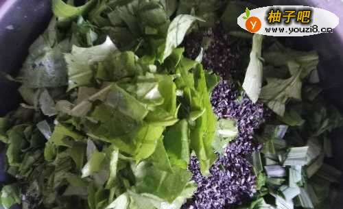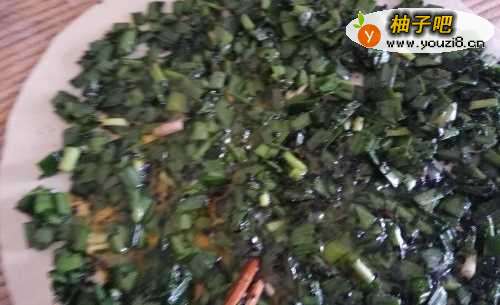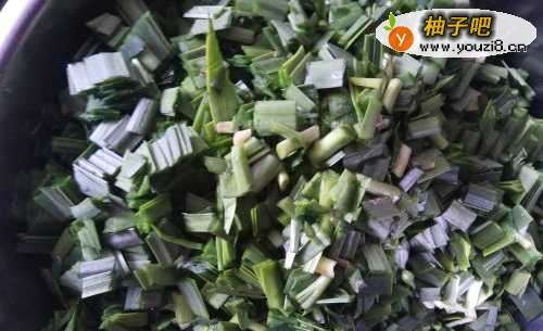 4将荠荠菜择干净(去黄叶去根部),然后用水也泡一泡,再淘洗干净,空水,然后切成小段,也放在盛韭菜的盆中。。